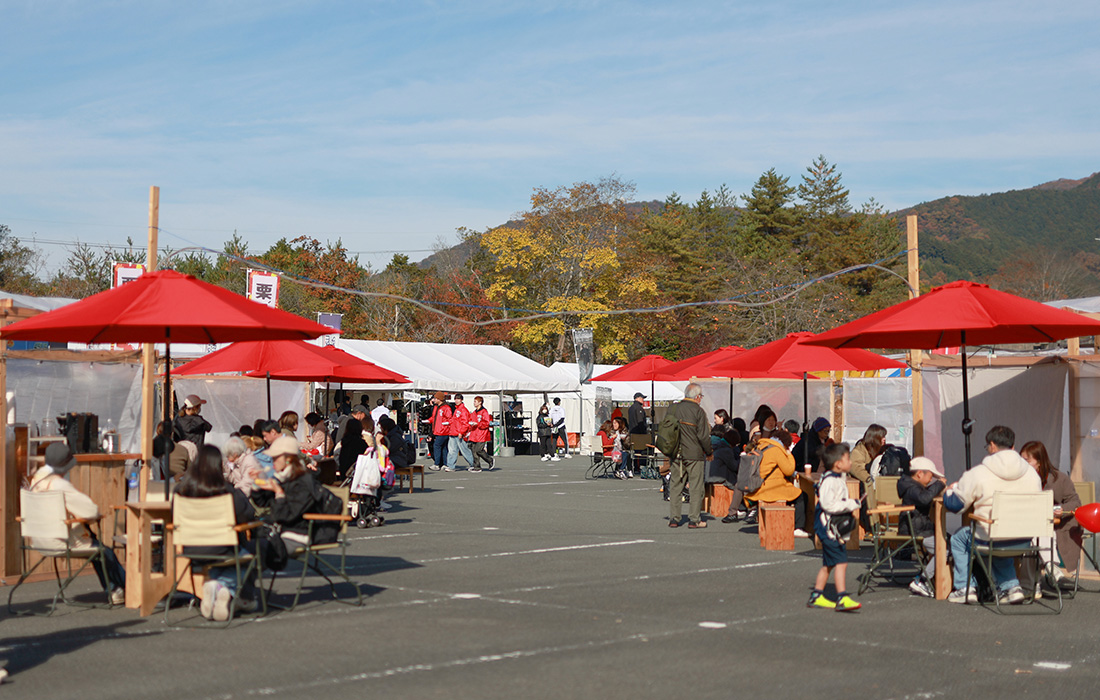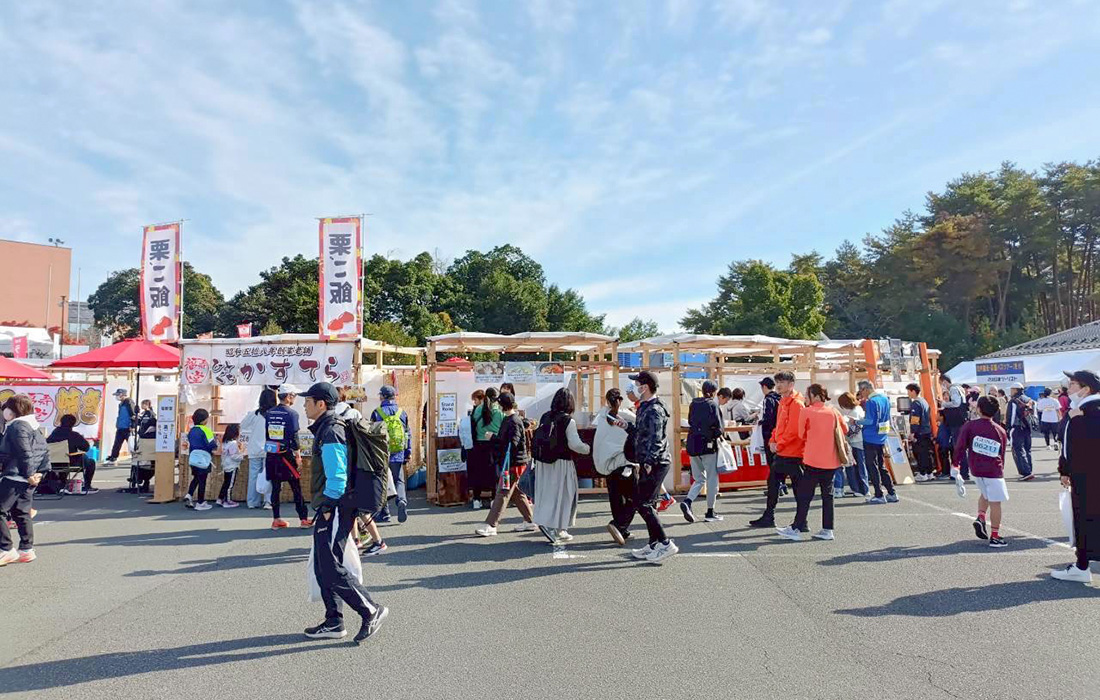 第33回福知山マラソンの会場となる三段池公園・武道館前には、限定14店舗が出店。